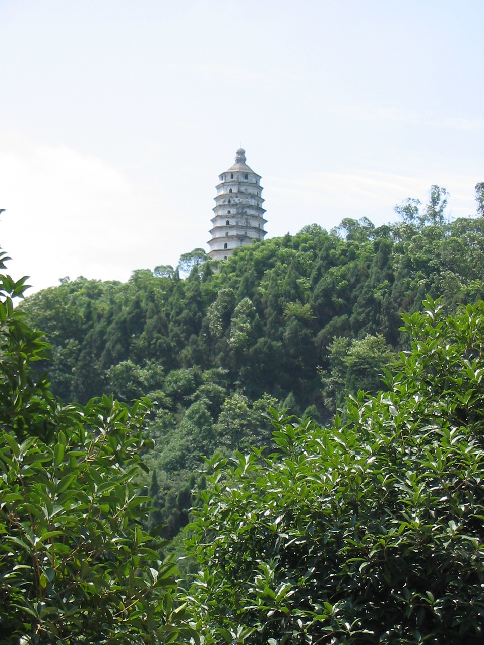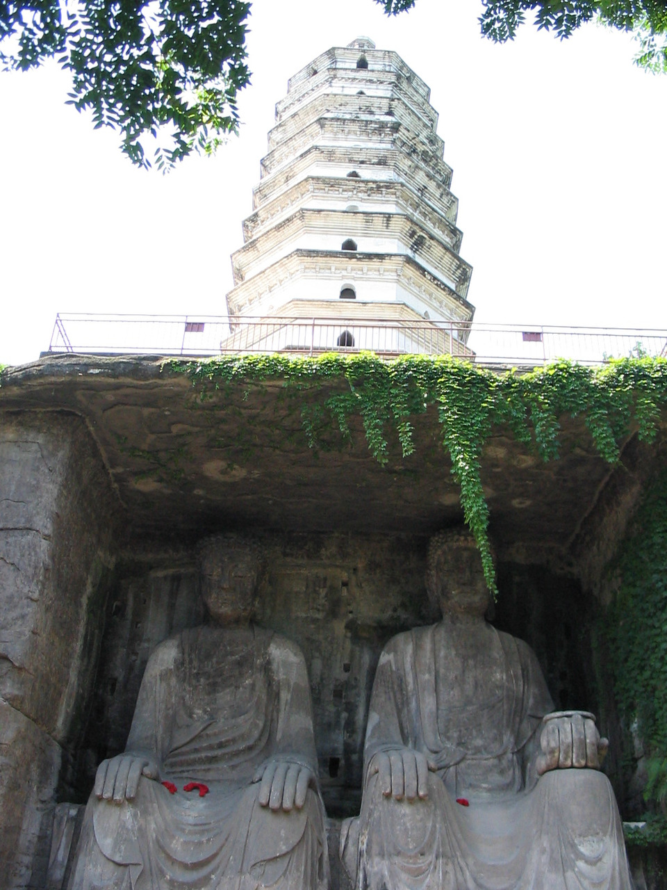 После Баодиншаня мы поехали в расположенный неподалеку Бейшань (Beishan), скульптурные композиции которого, оказались, на мой взгляд, не столь колоритны. Однако и там, нашлось нечто интересное. Во-первых, на вершине ближайшей горы, стремилась в небо многоярусная пагода, напоминающая космический корабль на стартовой площадке. А во-вторых, на склоне той же горы непосредственно под пагодой скрывался искусственный грот, в котором прятались каменные изваяния двух сидящих Будд. Любопытно, что находясь наверху, совершенно невозможно было догадаться о том, что находится тридцатью метрами ниже.