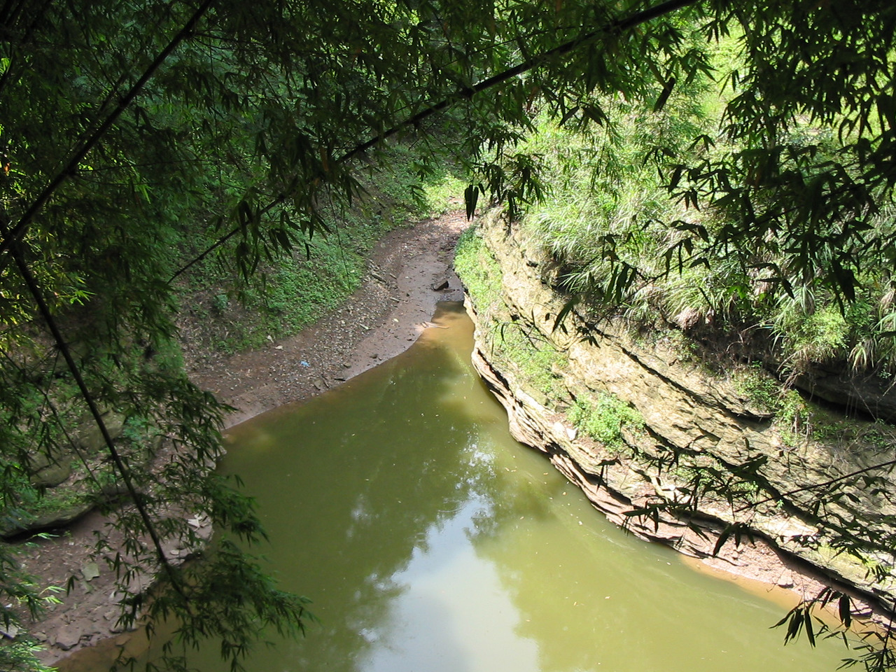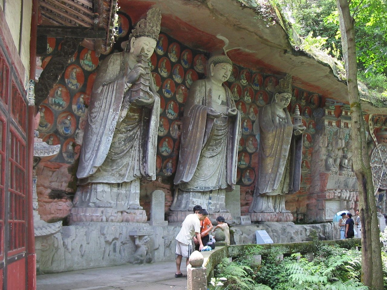 Дорога от Чунцина до Дацу заняла примерно три часа, на протяжении которых нам удалось увидеть и ярко-зеленые в это время года рисовые поля, и болотца, заросшие лотосом, и фруктовые сады, и, относительно невысокие, поросшие густыми зарослями бамбука горные склоны. Конечным пунктом поездки, стал горный поселок Баодиншань (Baodingshan). Последние пятьсот метров пути мы проехали в открытом туристическом вагончике на колесном ходу. Совсем рядом с поселком располагалось неглубокое ущелье, на склонах которого находились многочисленные барельефы или скульптуры, вырезанные вручную в мягкой горной породе.