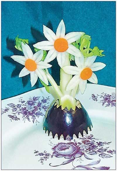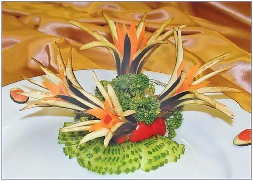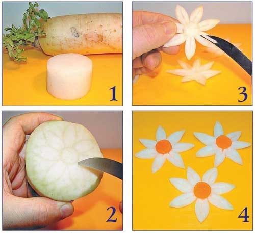Дайкон как будто специально создан природой для художественной резки: он в меру и жесткий, и пластичный, и плотный; легко впитывает красители. Это один из немногих овощей, которые позволяют создать не только мелкие элементы декора, но и большие объемные формы, в чем особенно преуспели мастера азиатских стран – Японии, Китая, Сингапура, Малайзии…
