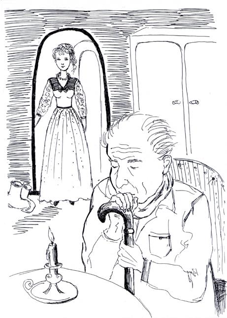 «Не помню я, всё позабылось совершенно, особенно теперь забылось. На былую смоль волос моих упала лунных бликов белизна; широкими волнами на ветру играли былые кудри. А каковы-то были кудри тогда! Лицо, когда-то румяное, свежее, совсем иссохло, – вот-вот, точно так же, как и двери мои, – потрескалось, перекосилось как-то всё лицо-то моё. Да и глаза не испускают прежних ярких искр, не охотятся за мыслью, не мечутся от тревоги, оставили желания, покорились времени, нашли лишь в нём покой; глаза, глаза-то совсем слабы, ах, слабы-то стали…»
