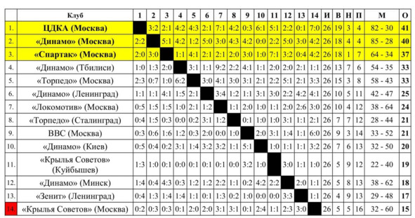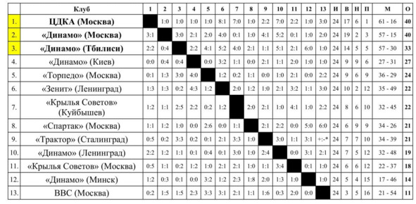 · Чемпион – ЦДКА Москва: В. Никаноров (в, 26 матчей), В. Чанов (в, 1), В. Чистохвалов (20), И. Кочетков (20), Ю. Нырков (12), К. Лясковский (15), А. Портнов (13), А. Водягин (22, 1), В. Соловьёв (22, 2), А. Башашкин (13), В. Афанасьев (9, 1), В. Николаев (22, 10), А. Гринин (26, 11), Г. Федотов (17, 13), В. Бобров (17, 23), В. Дёмин (26, 15), С. Шапошников (1), Е. Горбунов (1), Б. Коверзнев (1), М. Дидевич (12, 5), В. Колесников (1, 1). Старший тренер – Б.А.Аркадьев.