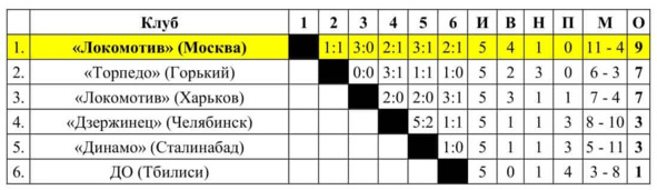 *Матч ВВС (Москва) – «Трактор» (Сталинград) прерван на 83 минуте при счёте 2:2 из-за драки футболистов. ВВС (Москва) засчитано поражение.