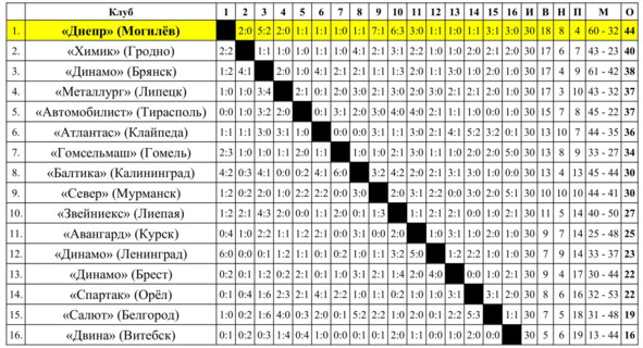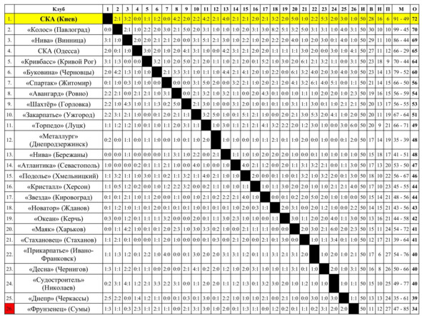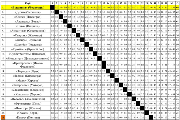 – Чемпион – «Днепр» (Днепропетровск): С. Краковский (в, 34), А. Дилай (34, 2), Н. Павлов (33, 3), В. Кузнецов (31, 7), О. Таран (30, 13), В. Устимчик (30, 5), П. Кутузов (27), О Серебрянский (26, 1), В. Лютый (24, 9), Г. Литовченко (24, 5), А. Погорелов (21, 5), О. Протасов (21, 7), А. Лысенко (17, 1), Ю. Миргородский (17), Н. Федоренко (17, 3), С. Пучков (13), А. Червоный (9), А. Бобриков (7), В Багмут (6), В, Устинов (6), О. Назаренко (5), В Кобзарев (5), В Зуев (2). Старший тренер – В.А.Емец.