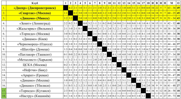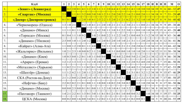 – Участники 18 команд, 443 футболиста. Проведёно 306 матчей, забито 725 мячей. Лучший бомбардир – Юрий Гаврилов «Спартак» (Москва) – 18 мячей. Зафиксировано 7 автоголов, 87 пенальти, 4 удалении. Игры обслуживали 35 арбитров. Средняя посещаемость – 20089 зрителей.