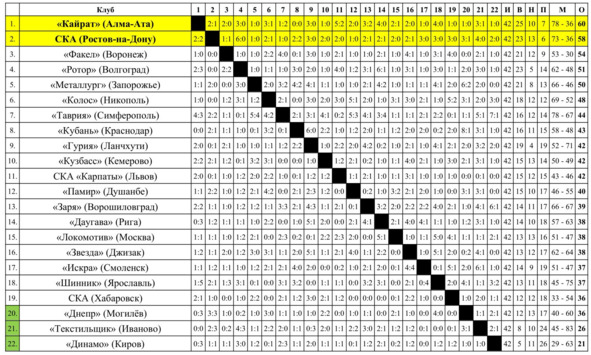 – Команды «Кайрат» (Алма-Ата) и СКА (Ростов-на-Дону) вышли в Высшую лигу.
