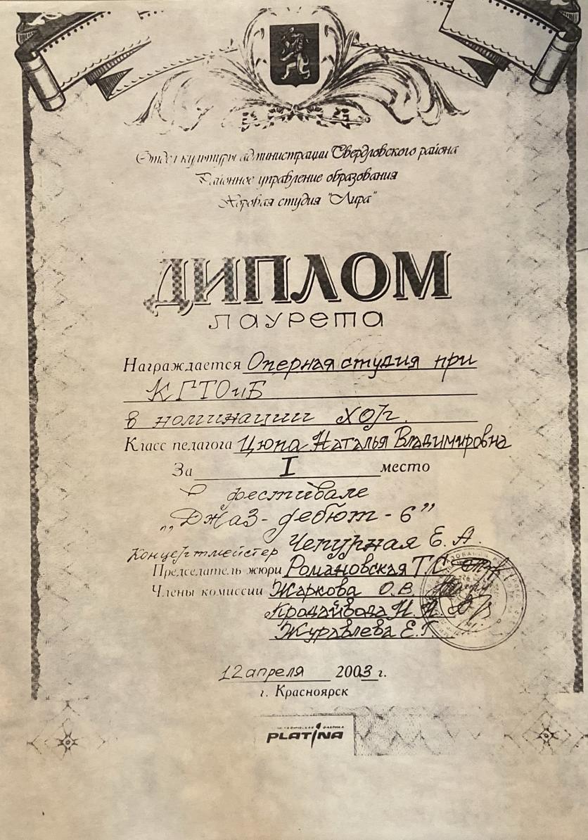 С 12 до 16 лет выступаю в Красноярском Государственном театре Оперы и Балета под руководством хормейстера Цюпы Натальи Владимировны (О Студия). Это участие в Богеме, Кармине Буране, Буратино, Кармен, Щелкунчик. Сольная роль Петера в новогоднем спектакле "Под первой звездой". Первые места во многочисленных джазовых конкурсах и фестивалях, проводимых в районе г. Красноярск.