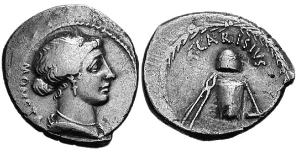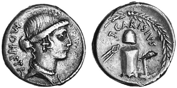 Таким образом, первым из ряда великих монет в этой книге с полным основанием можно назвать денарий монетария Тита Каризия 46 года до н. э. На аверсе этой серебряной монеты отчеканена голова Юноны, легенда называет богиню дорогим для нас именем: «MONETA». Реверс представляет «инструменты работников монетного двора – щипцы, молот и нижний штемпель; здесь же изображена и остроконечная шапка с лавровым венком – принадлежность бога Вулкана, покровителя кузнечного ремесла» (формулировка В.В. Рязанова из книги «Монеты и монетарии Римской республики»). Также на реверсе имя монетария: «T.CARISIVS».