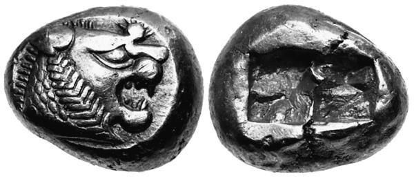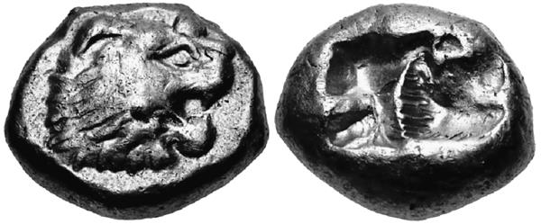 С историками мне так и не удалось (заочно, конечно) договориться о том, кто же и когда отчеканил первую в мире монету. Очень привлекательна (из-за её древности) довольно распространённая версия, что начал чеканку монет царь Лидии Гиг (правил ок. 680–644 или 645 годов до н. э.). Он, дескать, был человеком практичным и предприимчивым. И вот как раз ему-то и посчастливилось придумать деньги. Произошло это около 650 года до н. э.