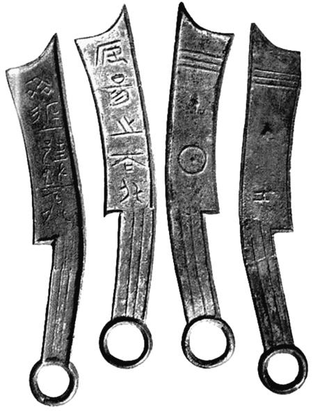 Монеты-ножи. Китай. С надписью «[удел] Ци», VII [?] – III вв. до н. э. (левый и правый и справа), с надписью «[город] Аньян», VI–V вв. до н. э. (два ракурса в середине). Бронза. По А. Быкову
