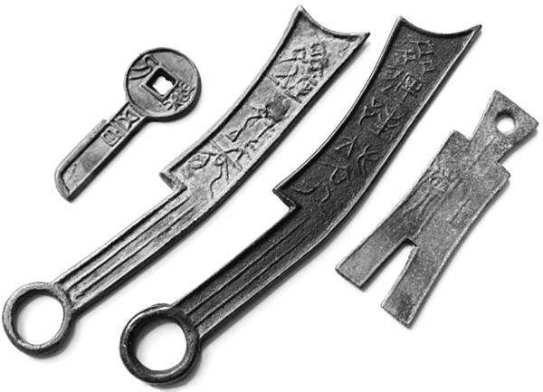 Подобно древним китайским производственным орудиям древние китайские монеты отливались из бронзы. Они имели форму мотыг, плоских бляшек («лицо духа» и «нос муравья»), ножей (иногда похожих на современные ключи), лопат, а также – в первые годы нашей эры – довольно увесистых кружков с дыркой, которые китайские коллекционеры называют «печеньками».