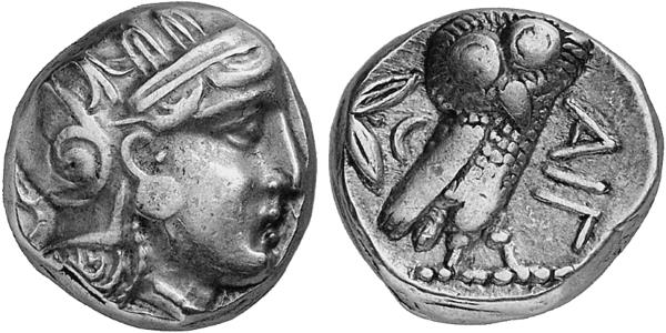 Древние греки были одними из первых, после Эгины и Персии, кто освоил технику двусторонней чеканки. Очень вовремя подоспело серебро из рудников на горе Лаврион, что на юго-востоке Аттики. С VI века до н. э. Лаврионские рудники находились в собственности Древних Афин. Обладание большими запасами серебра позволило Афинам утвердить свой монетный стандарт в древнегреческом мире. Была введена аттическая серебряная драхма весом 4,37 г.