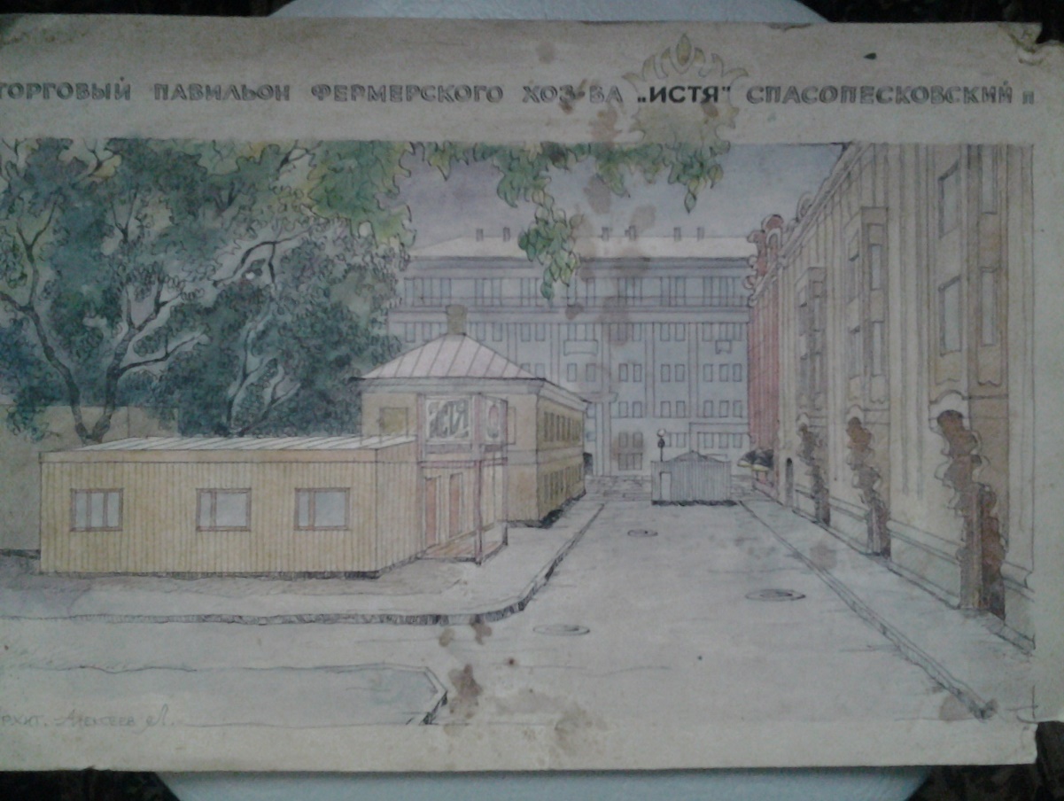 Выцветшее и пожелтевшее изображение нашего магазина в Спаспеско-вском переулке на рисунке архитектора