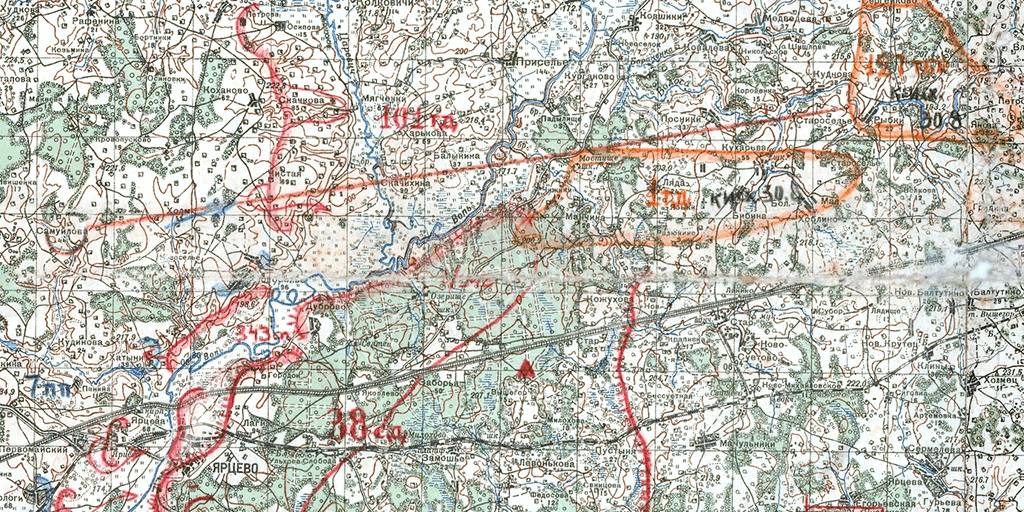 8. 127 танковая бригада – резерв Командарма. С выходом пехоты 1 тд и 152 сд на рубеж Самуйлова, Кудинова приступить к переправе через р. Вопь и выйти в район сбора лес западнее Холм и юго-западнее Новоселье (зап.).
