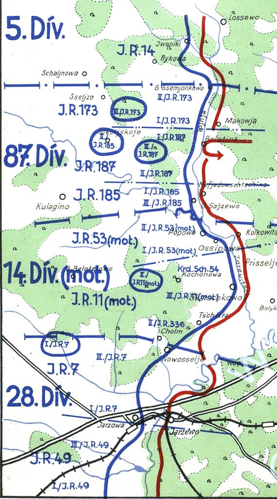 Командование 14-й моторизованной дивизии (14. Div (mot)) вермахта сообщает командиру 11-го моторизованного полка (I.R. 11 (mot)), что после сильной артподготовки и при поддержке танков противник крупными силами прорвал линию фронта на участке 2-го батальона 336-го пехотного полка (II./I.R. 336).