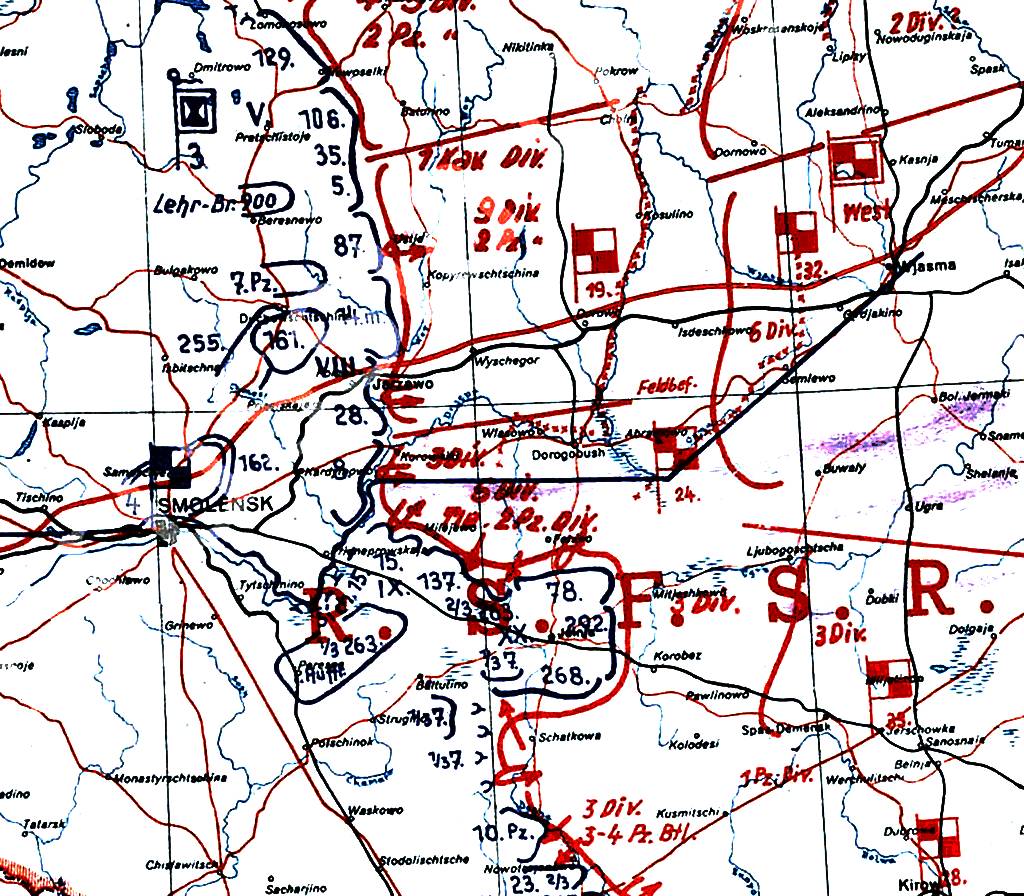 3. Путь подвоза и эвакуации: Дорогобуж, Шишкино, Бекедово, Княжино, Петровская, Рыбки, Кухарева, Ляда, Манчина, Озерище. Регулирование путей – средствами армии.