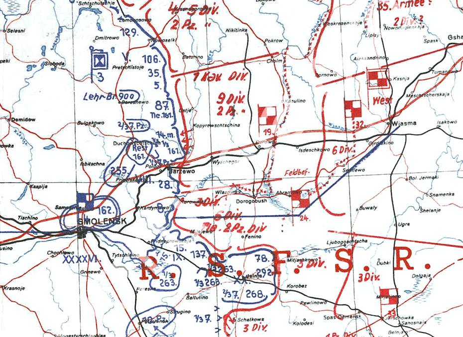 Согласно ЖБД 16-й А68 и Отчёта о боевых действиях 16-й А против немецких фашистов (сентябрьское наступление под Ярцевым)69 противник, подтянув ближайшие резервы, часто переходит в контратаки. Около 13:00 силою более пехотного полка, поддерживаемый сильным артиллерийским и миномётным огнём, проводится контратака во фланг 1-й тд со стороны Кровопусково и лесов западнее его. В результате этого стрелковые подразделения 1-й тд отдали рубеж Холм, лес западнее Новоселье (зап.).