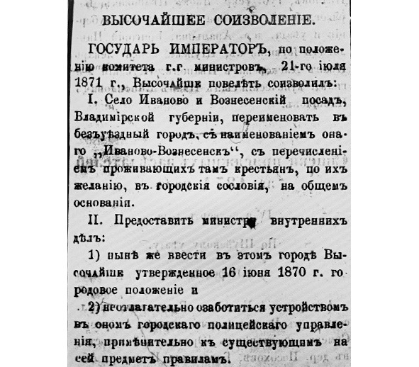 Село Иваново и Вознесенский посад Владимирской губернии переименовать в безуездный город с наименованием оного «Иваново-Вознесенск» с перечислением проживающих там крестьян по их желанию в городские сословия на общем основании.