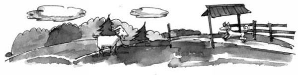 Пришлось снова сделать забег и повернуть молодых кур в сторону речки, куда, голося, будто сзывая остальных, бежал старый рыжий петух, уводя за собой добрую сотню кур.