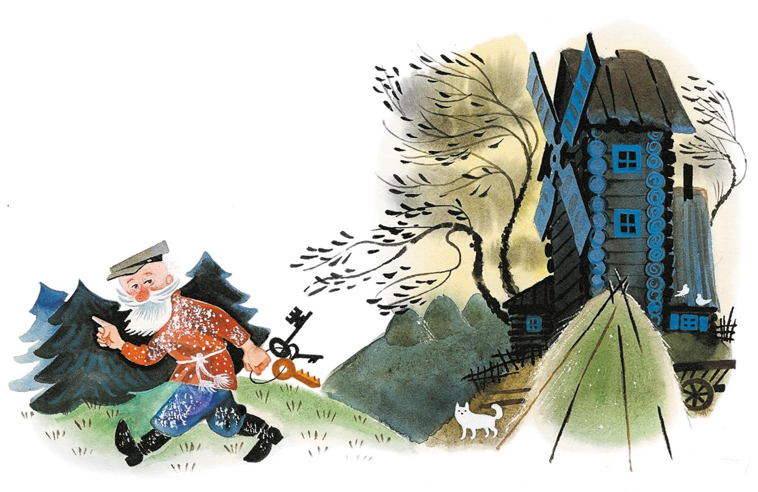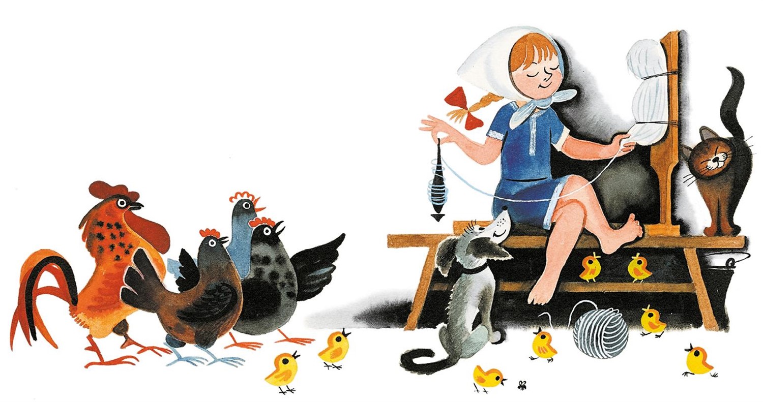 – Ниточки льняные, ниточки шерстяные, ниточки хлопковые, ниточки шёлковые! Простите меня, старуху сварливую, торопливую, нерадивую. Вернитесь в мою избу.