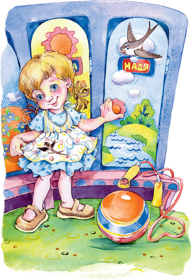 Тут Надя нашла свой шкаф, свой стул, своё полотенце. Фартучек свой увидела. На нём тоже ласточка вышита была.