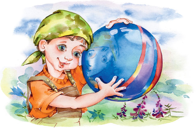 Хороший мяч прислал дедушка своему внуку Алику. Такой красивый, что и нарисовать трудно. Половина мяча синяя-синяя, как небо. Другая половина ярко-красная, как летняя заря. И весь он такой блестящий, такой лакированный, что в нём и окошки, и стены, и Аликово лицо отражаются, как в зеркале. А величиной мяч с арбуз. Даже больше арбуза.