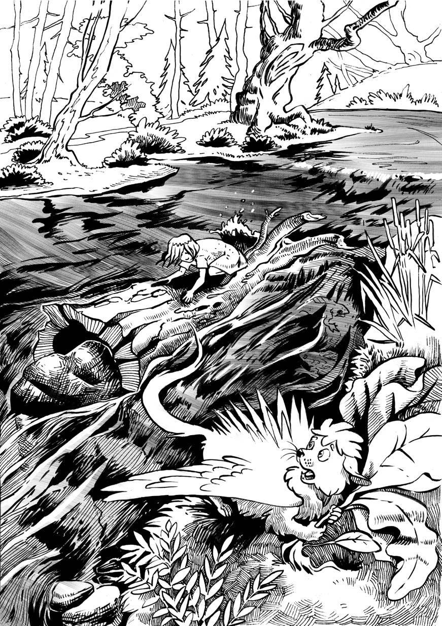 Вода пенилась и бурлила. То в одном месте, то в другом появлялись водовороты, а посередине, в ловушке из двух камней застряло бревно, теперь крутящееся вокруг своей оси. Но самым странным было то, что на бревне сидит мокрое существо и отчаянно пытается не свалиться в ревущий водный поток.