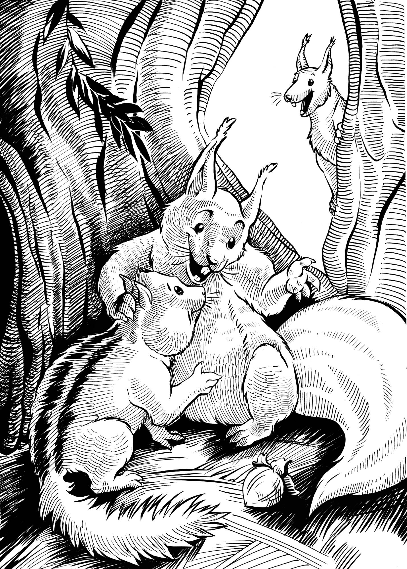 – Ну, держись, Прыг! – пискнул Сим и помчался за бельчонком. Тот, цокая, пустился наутёк.