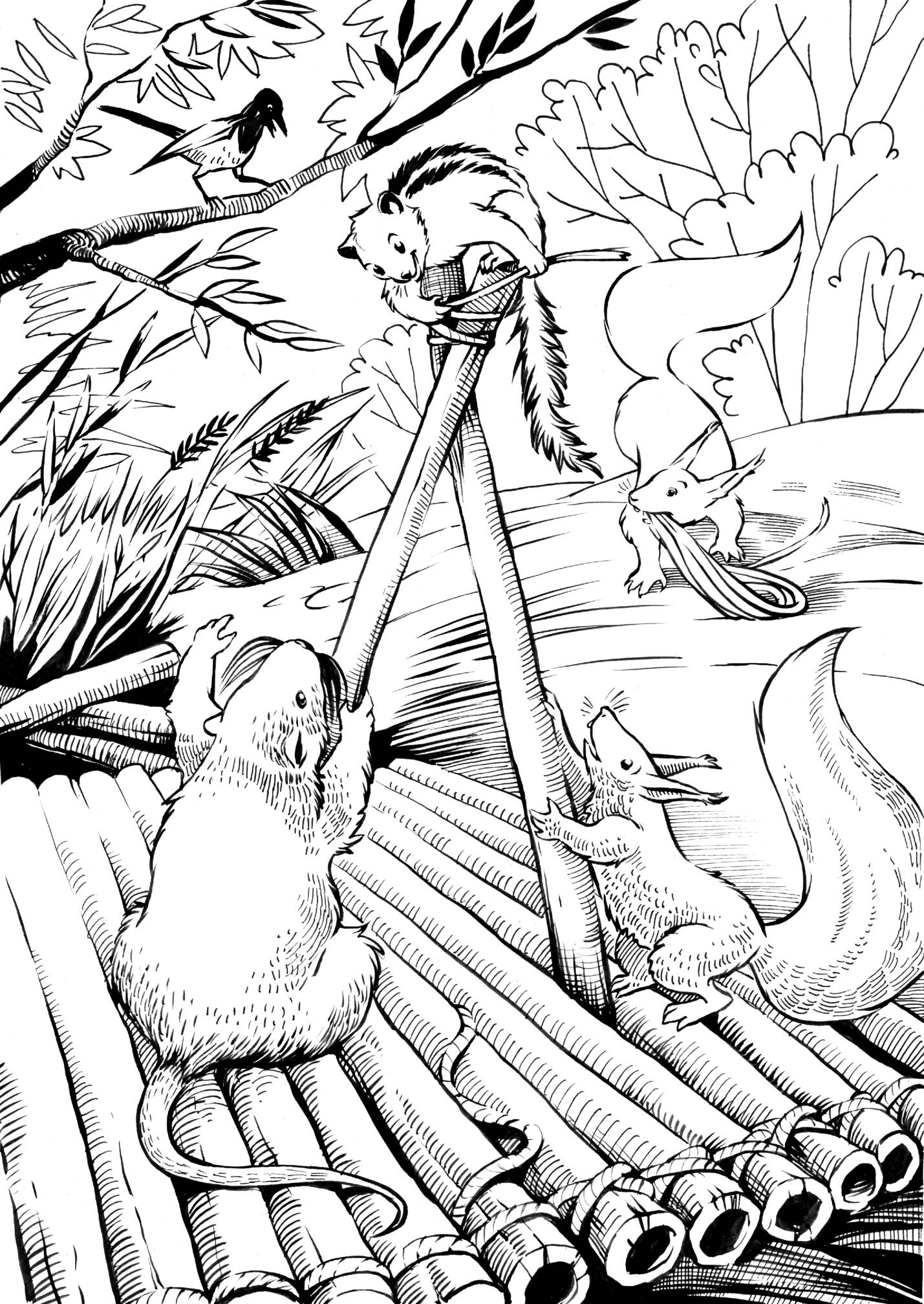 Наконец, когда собралось тридцать идеально ровных брёвен (пожалуй, мы с вами сочли бы их просто палками) началась их обработка. Для этого господин Ондатр с помощью своего хвоста отмерял необходимую длину и перегрызал бревно, укорачивая его. Бельчата и Сим тем временем занимались поисками прочной верёвки и паруса.