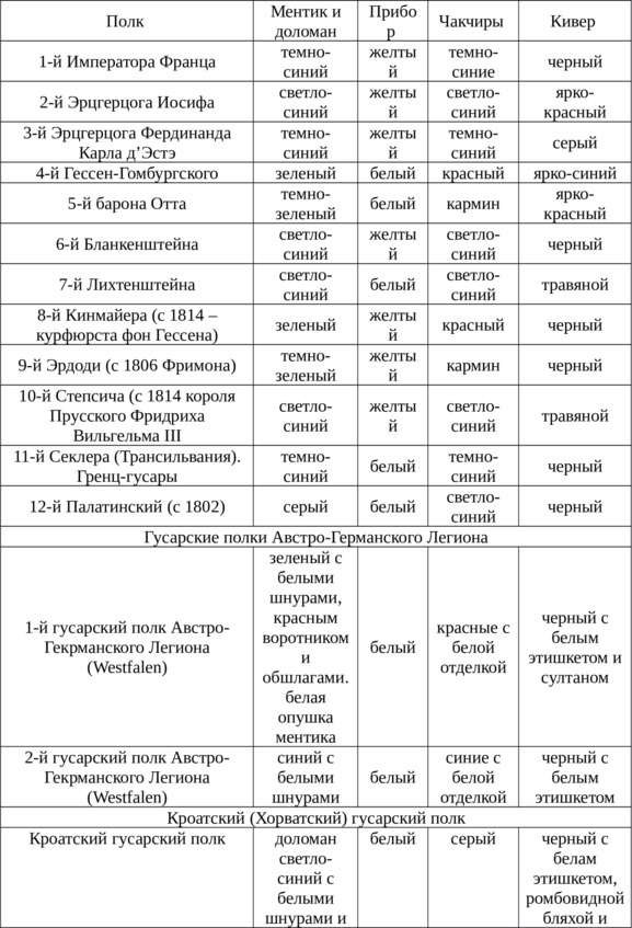 К 1812 в Австрии существовало 12 регулярных гусарских полков, а также 2 полка Австро-Германского Легиона и 2 Кроатских (хорватских) гусарских полка, официально числившихся во французской армии.