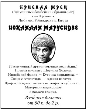 Затем на свет были извлечены: азбука для глухонемых, благотворительные открытки, эмалевые нагрудные знаки и афиша с портретом самого Бендера в шальварах и чалме. На афише было написано: