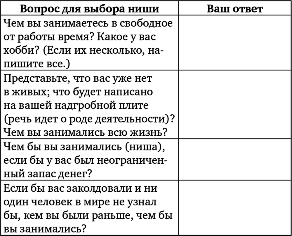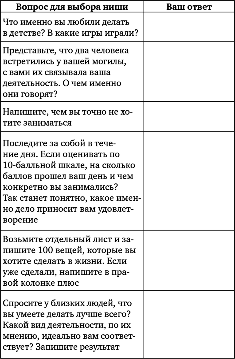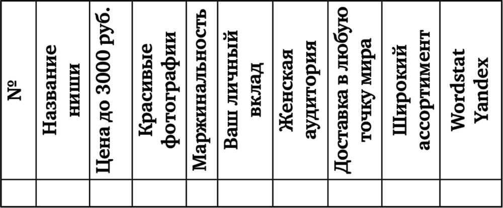 Если у вас нет никакого опыта в бизнесе, то ваша цель – выбрать дело, которое будет приносить деньги. И заработать деньги. Не стоит долго искать любимое дело, копаться в душе, нужно просто выписать 100 ниш. Совершенно любых. Сделайте таблицу: по вертикали – список из 100 ниш, по горизонтали – список критериев. Если ниша соответствует критерию, ставьте «+». Если нет – оставляете пустое место. Так вы проходите все критерии по одной нише и переходите к другой (табл. 2).