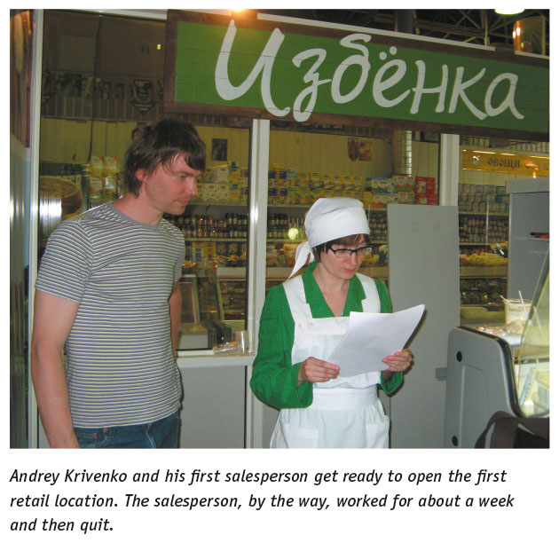 The fourth store opened in a new location. Before this, Andrey had intuitively chosen available space at farmers' markets, counting on the considerable traffic from the market's customers. But the final experimental location was in a shopping mall, close to a Billa supermarket in Mitino (a large suburb of Moscow).