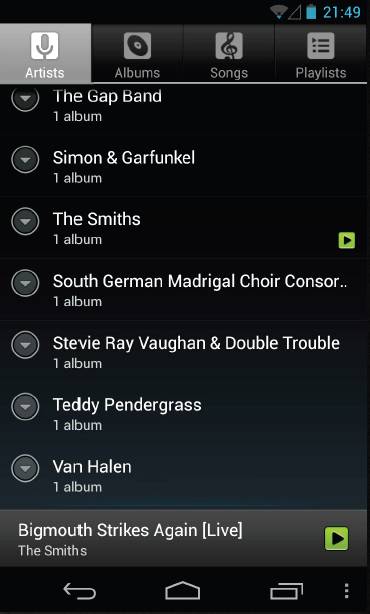 Для примера давайте взглянем на приложение «Музыка». Приложение «Музыка» имеет несколько различных экранов пользовательского интерфейса, которые показывают, например, ваши музыкальные записи. Показаны песни в исполнении одного артиста, позволяя вам выбрать одну песню данного исполнителя и проиграть эту песню.
