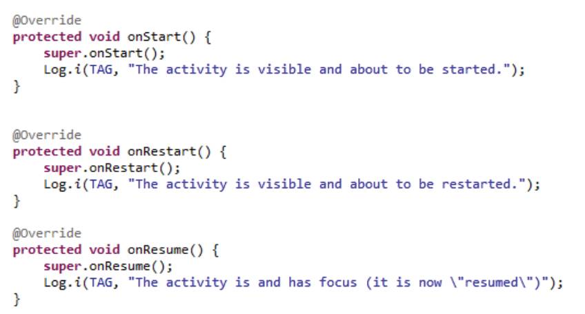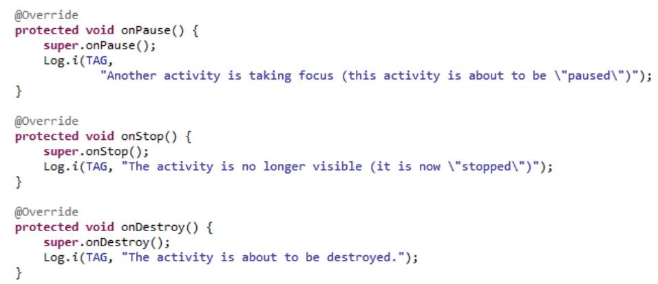 Чтобы поддерживать сценарии как этот, Android сообщает об изменениях жизненного цикла в Activity, вызывая предопределенные методы (call back) жизненного цикла. И вот некоторые из этих методов: