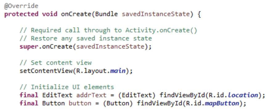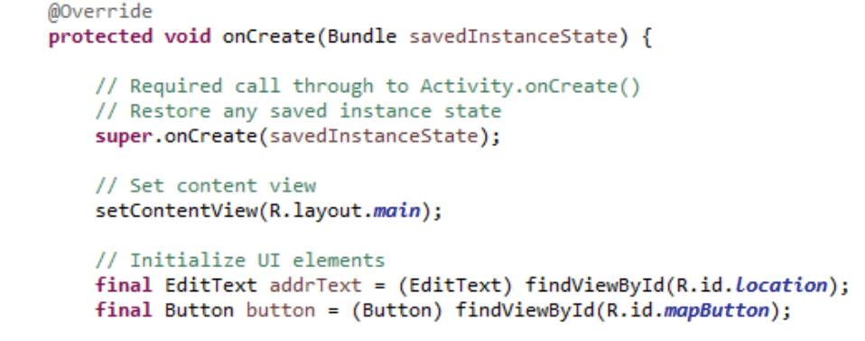 Давайте рассмотрим метод onCreate приложения «MapLocation». @Override – переопределяет activity.onCreate. В методе onCreate вы видите четыре функции, о которых мы говорили.