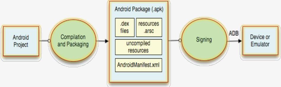 Во-первых, вы создаете исходный код и код ресурсов, которые составляют приложение. Далее, вы компилируете исходный код и подготавливаете свои ресурсы. Результатом этого шага является пакет Android или APK, который является исполняемым файлом приложения. Далее APK подписывается цифровой подписью, чтобы идентифицировать вас как разработчика и, наконец, APK устанавливается на устройство или эмулятор и запускается.