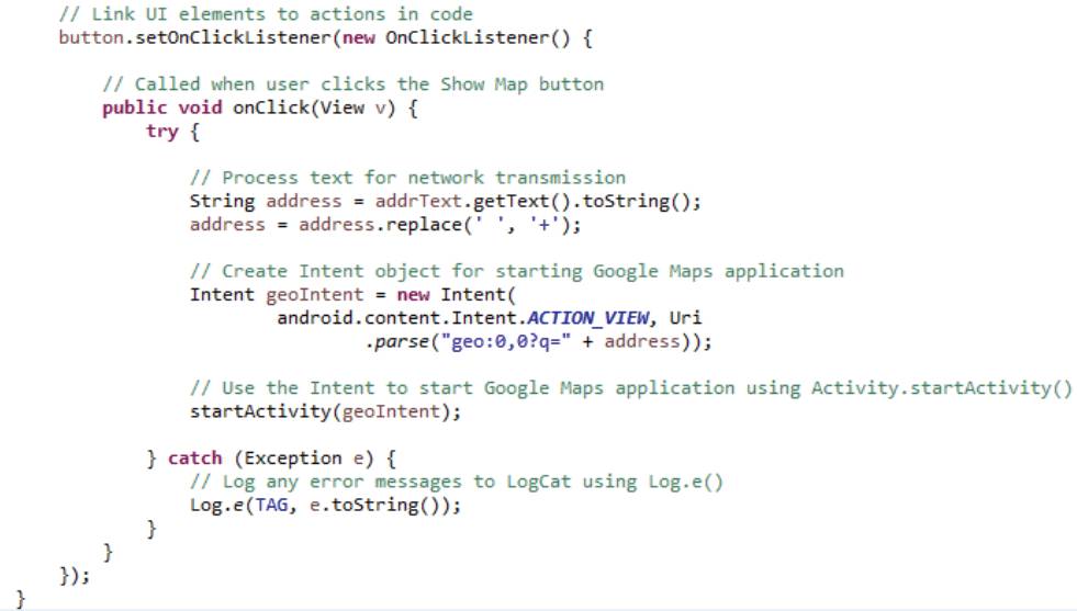 И наконец, есть некоторый код, который определяет что сделать, когда пользователь нажимает кнопку Show Map. Этот код реализует интерфейс onClickListener («слушатель» кликов), в котором есть метод onClick, вызывающийся каждый раз, когда пользователь кликает по кнопке. Код в методе onClick сначала считывает текст, который пользователь ввел в поле адреса. Затем он обрабатывает этот текст, чтобы удалить пробелы, и преобразовывает его в формат, который понимает «Google Maps». Затем он запускает приложение «Google Maps» и передает ему этот преобразованный адрес.