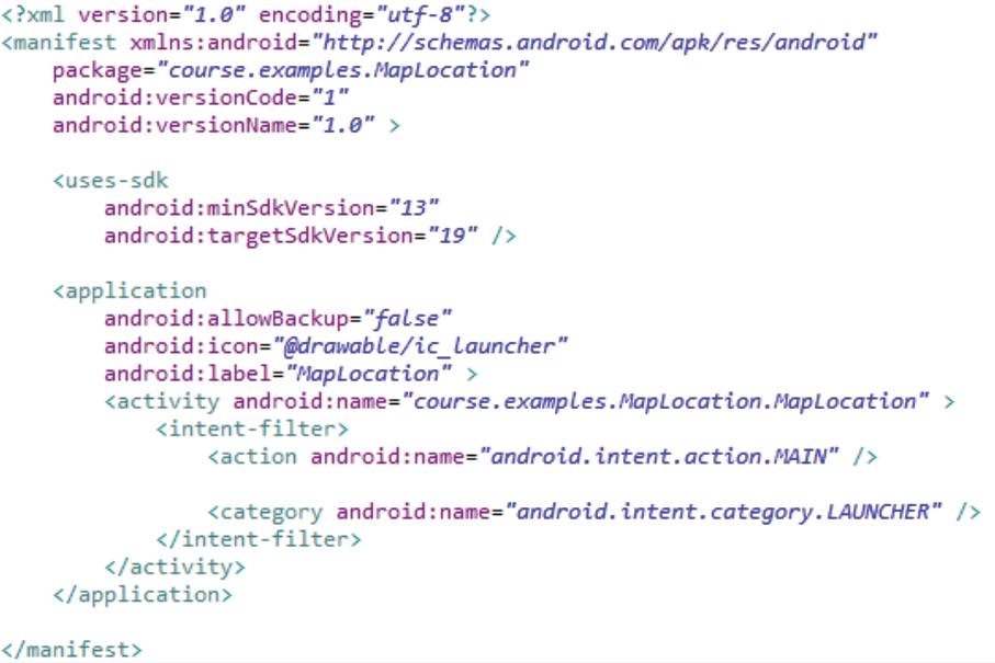 Следующий элемент манифеста – application, который содержит различные атрибуты: иконку для этого приложения, метку, которая показана в строке заголовка приложения, элемент Activity, который перечисляет в нашем случае всего одну Activity – MapLocation, которое включает это приложение.