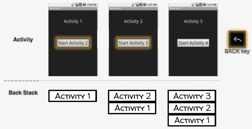 Когда пользователь выполняет свою задачу, он перемещается по цепочке из Activity, и Android помогает пользователям в навигации несколькими способами, поддерживая концепцию приложения, обеспечивая временное хранение Activity в стеке (backstack), так что они должным образом могут быть приостановлены и затем возобновлены при возврате из стека.