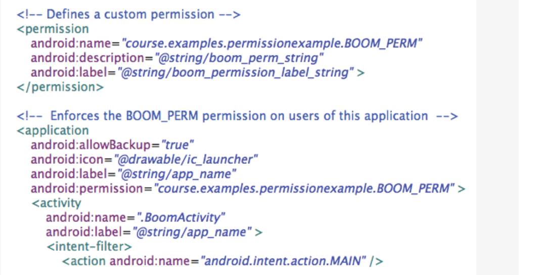 Давайте откроем файл androidmanifest.xml, чтобы видеть, как это реализуется. Вы видите тег permission, который определяет новое разрешение – course.examples.permissionexample.boom_perm.