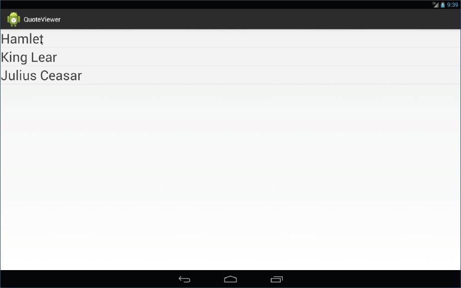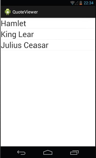 Если я запущу приложение «QuoteViewer», первая Activity покажет нам заголовки трех пьес Шекспира: «Гамлет», «Король Лир» и «Юлий Цезарь». Далее я выберу Hamlet. Запустится вторая Activity, которая покажет мне цитату Горацио: «Now cracks a noble heart. Good night sweet prince, and flights of angels sing thee to thy rest».