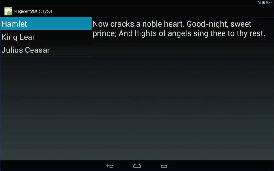 Давайте рассмотрим приложение «FragmentStaticLayout» и посмотрим, как оно определяет свой лейаут. На левой панели показаны заголовки пьес Шекспира, а на правой панели показаны цитаты из этих пьес. И каждая из этих панелей реализована отдельным фрагментом, один называется TitleFragment, а другой QuoteFragment. И основная Activity этого приложения называется QuoteViewerActivity.