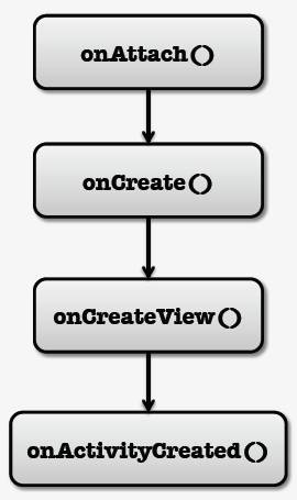 Когда содержащая фрагмент Activity создается, фрагмент может получить несколько вызовов метода жизненного цикла. Во-первых, когда фрагмент присоединяется к своей Activity, он получает вызов onAttach. Затем фрагмент принимает вызов своего метода onCreate. И отметьте здесь для себя, что речь идет о методе fragment.onCreate, а не activity.onCreate, который вызывается при создании Activity. Вы инициализируете фрагмент в методе фрагмента onCreate, различие между двумя методами в том, что, в отличие от activity.onCreate, пользовательский интерфейс в fragment.onCreate вы не устанавливаете. Это фактически происходит в следующем методе.