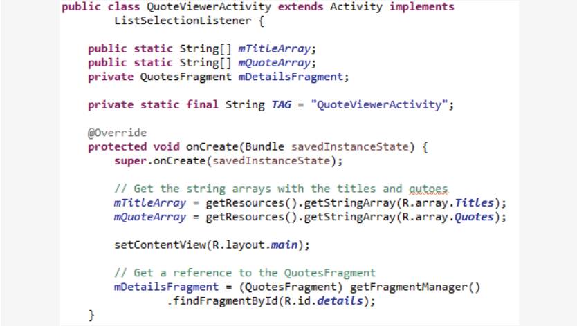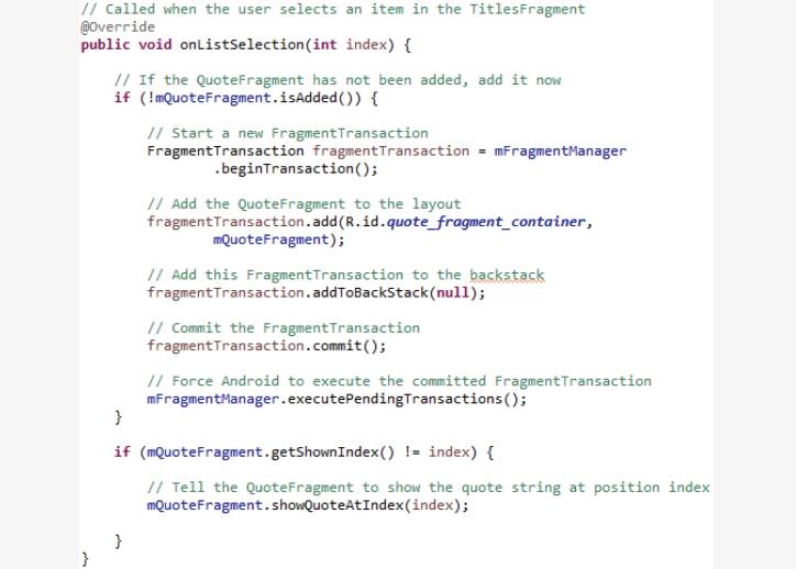 Теперь рассмотрим код. На сей раз в начале мы добавим только TitleFragment, а фрагмент с цитатами будем добавлять только, если пользователь кликнет по заголовку. Предположим, пользователь действительно кликает по заголовку. Тогда будет вызван метод onListSelection. Рассмотрим этот метод.