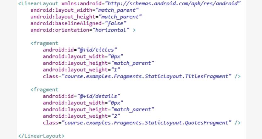 Как видите, весь лейаут состоит из LinearLayout, и что LinearLayout содержит два фрагмента. И в тегах