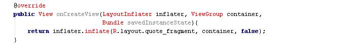Этот метод вызывает метод inflate класса LayoutInflater, передавая файл лейаута (quote_fragment.xml) в качестве параметра. Это работает подобно тому, что происходит в setContentView.