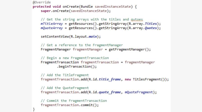 Теперь давайте вернемся к методу onCreate в QuoteViewerActivity и пройдем по тем четырем шагам, добавляя фрагменты в Activity. Во-первых, получаем ссылку на FragmentManager. Затем вызываем метод beginTransaction. В результате получим FragmentTransaction. Затем вызываем метод add, передавая ID FrameLayout во фрагмент, который будет содержать этот FrameLayout. Это надо сделать и для TitleFragment, и для QuoteFragment. И, наконец, вызовем метод commit, чтобы зафиксировать все изменения.