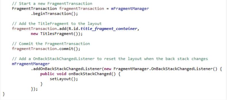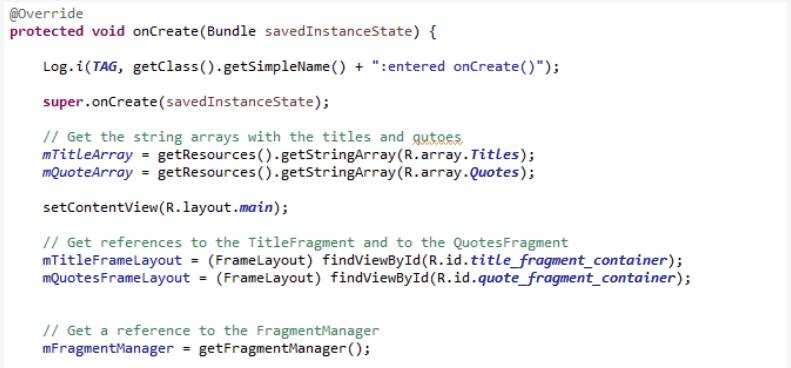Во-первых, мы проверяем, был ли фрагмент с цитатами уже добавлен в layout. И, если нет, то мы добавим его, запуская другой FragmentTransaction.