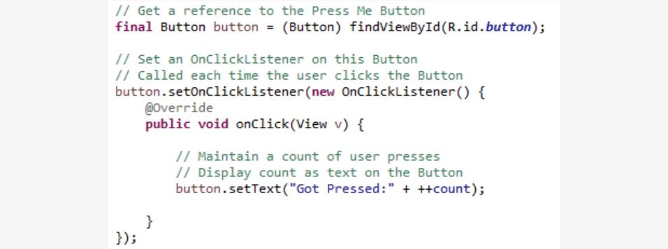 Код этой Activity создал объект-кнопку (button) и присоединил (setOnClickListener) «слушателя» этой кнопки. И каждый раз при нажатии на эту кнопку Android вызывает метод onClick «слушателя» кнопки (OnClickListener).