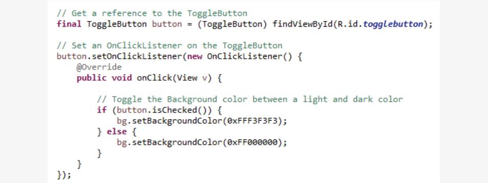 Следующая вьюшка называется ToggleButton (переключатель). Переключатель – это другой вид кнопки, однако имеет дополнительное свойство – когда вы нажимаете его, он остается нажатым, пока вы не нажмете его снова. Таким образом, переключатель всегда находится в одном из двух состояний – включено или выключено. Переключатели также обычно выводят на экран некоторый индикатор, чтобы сообщить пользователю, в каком положении находится кнопка в настоящее время.